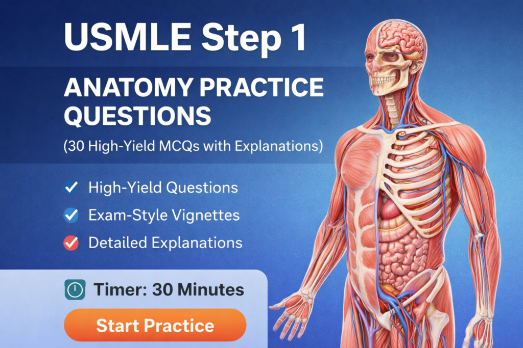 This page includes 30 high-yield USMLE Step 1 anatomy practice questions with detailed explanations, carefully designed to reflect real exam-style clinical vignettes. These questions are suitable for U.S. and Canadian medical students, as well as international medical graduates (IMGs) preparing for Step 1.